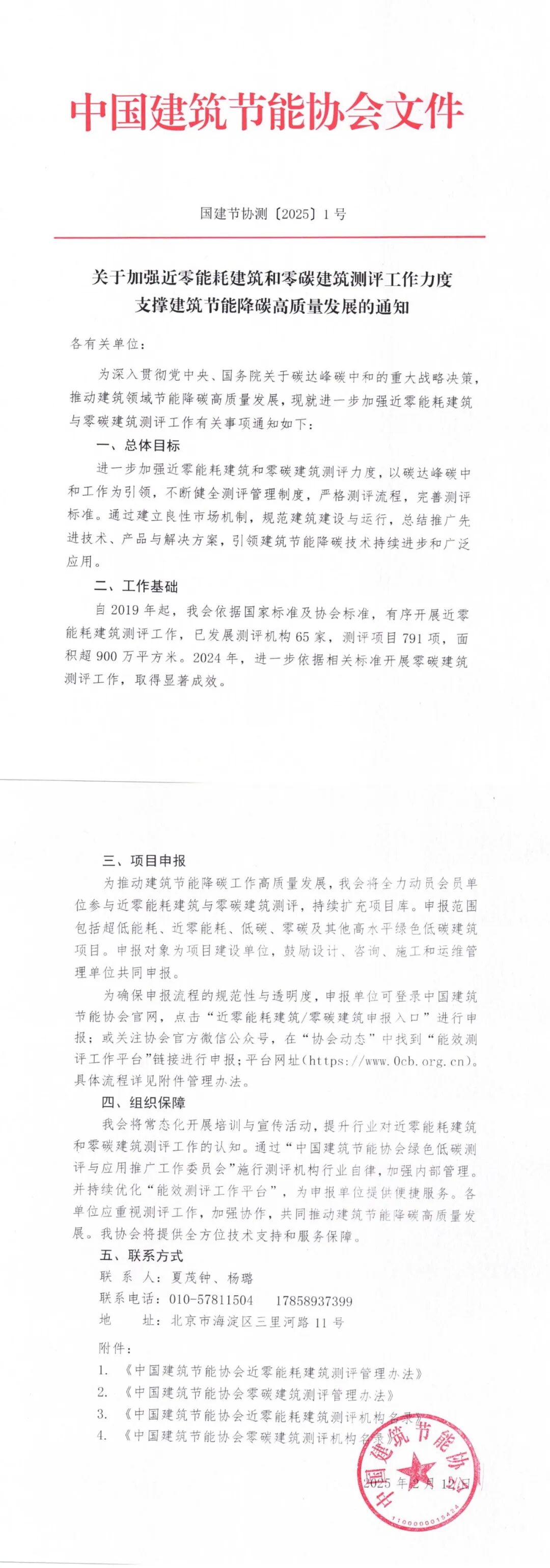 为深入贯彻党中央、国务院关于碳达峰碳中和的重大战略决策,推动建筑领域节能降碳高质量发展,现就进一步加强近零能耗建筑与零碳建筑测评工作有关事项通知如下:进一步加强近零能耗建筑和零碳建筑测评力度,以碳达峰碳中和工作为引领,不断健全测评管理制度,严格测评流程,完善测评标准。通过建立良性市场机制,规范建筑建设与运行,总结推广先进技术、产品与解决方案,引领建筑节能降碳技术持续进步和广泛应用。自2019年起,我会依据国家标准及协会标准,有序开展近零能耗建筑测评工作,已发展测评机构65家,测评项目791项,面积超900万平方米。2024年,进一步依据相关标准开展零碳建筑测评工作,取得显著成效。为推动建筑节能降碳工作高质量发展,我会将全力动员会员单位参与近零能耗建筑与零碳建筑测评,持续扩充项目库。申报范围包括超低能耗、近零能耗、低碳、零碳及其他高水平绿色低碳建筑项目。申报对象为项目建设单位,鼓励设计、咨询、施工和运维管理单位共同申报。为确保申报流程的规范性与透明度,申报单位可登录中国建筑节能协会官网,点击“近零能耗建筑/零碳建筑申报入口”进行申报;或关注协会官方微信公众号,在“协会动态”中找到“能效测评工作平台”链接进行申报;平台网址(https://www.0cb.org.cn)。具体流程详见附件管理办法。