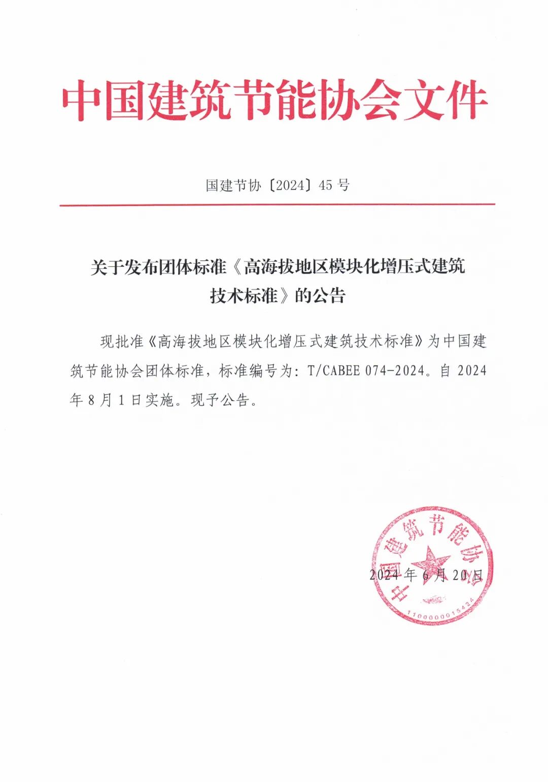 关于发布团体标准《高海拔地区模块化增压式建筑技术标准》的公告