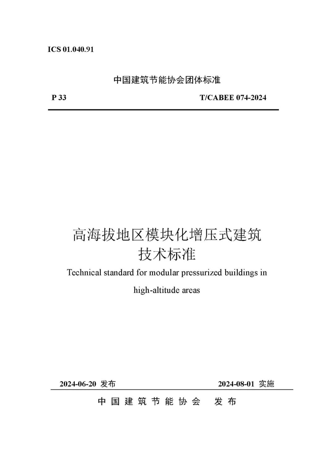 现批准《高海拔地区模块化增压式建筑技术标准》为中国建筑节能协会团体标准,标准编号为:T/CABEE 074-2024。自2024年8月1日实施。现予公告。