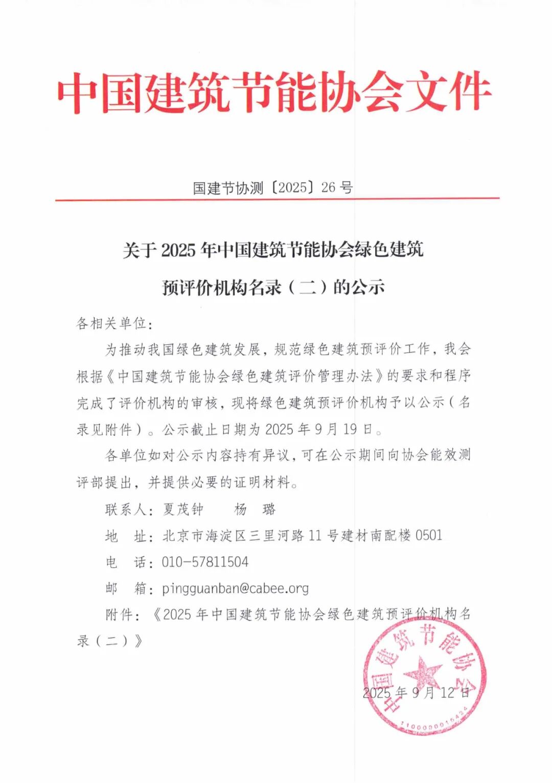 为推动我国绿色建筑发展,规范绿色建筑预评价工作,我会根据《中国建筑节能协会绿色建筑评价管理办法》的要求和程序完成了评价机构的审核,现将绿色建筑预评价机构予以公示(名录见附件)。公示截止日期为2025年9月19日。