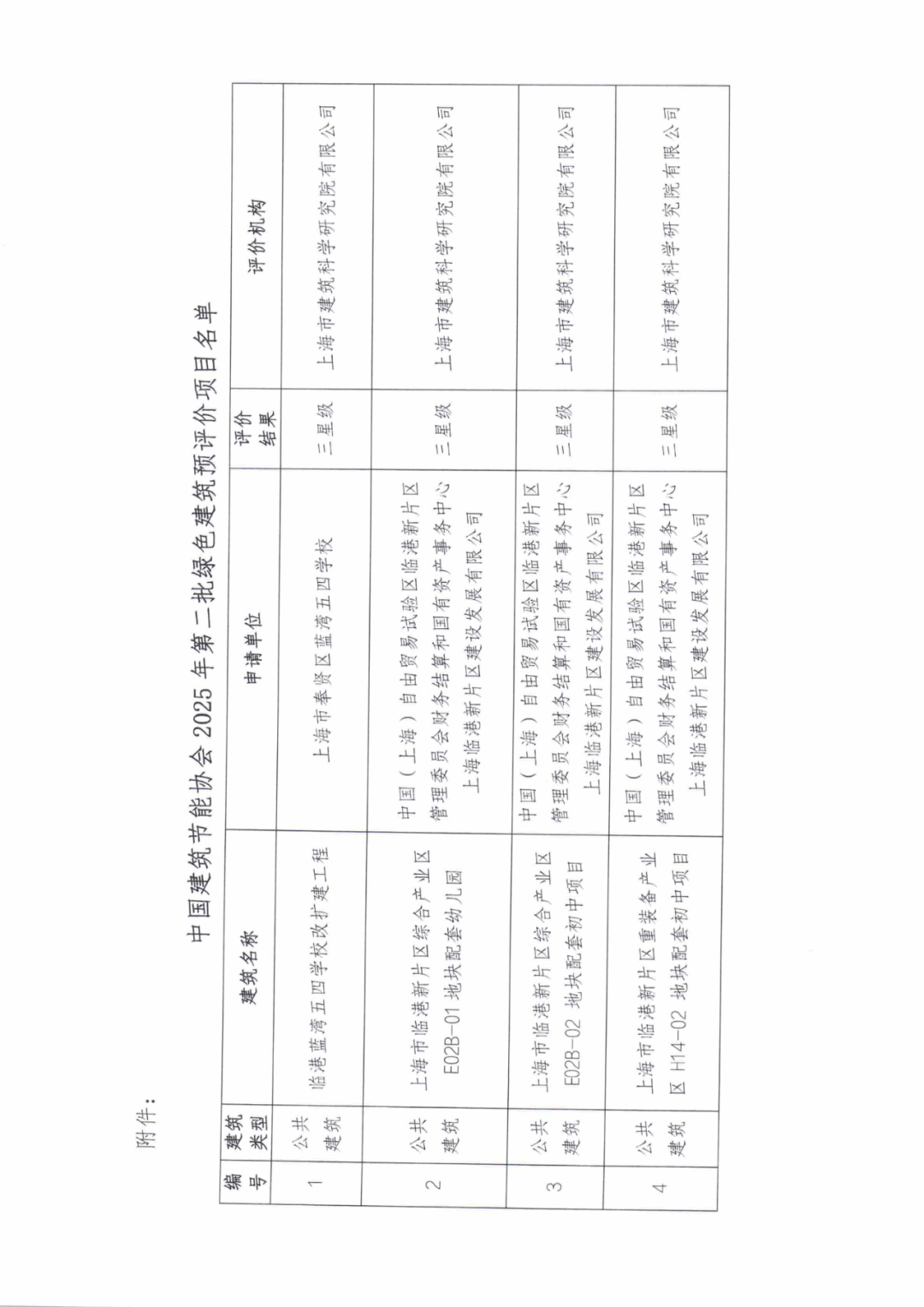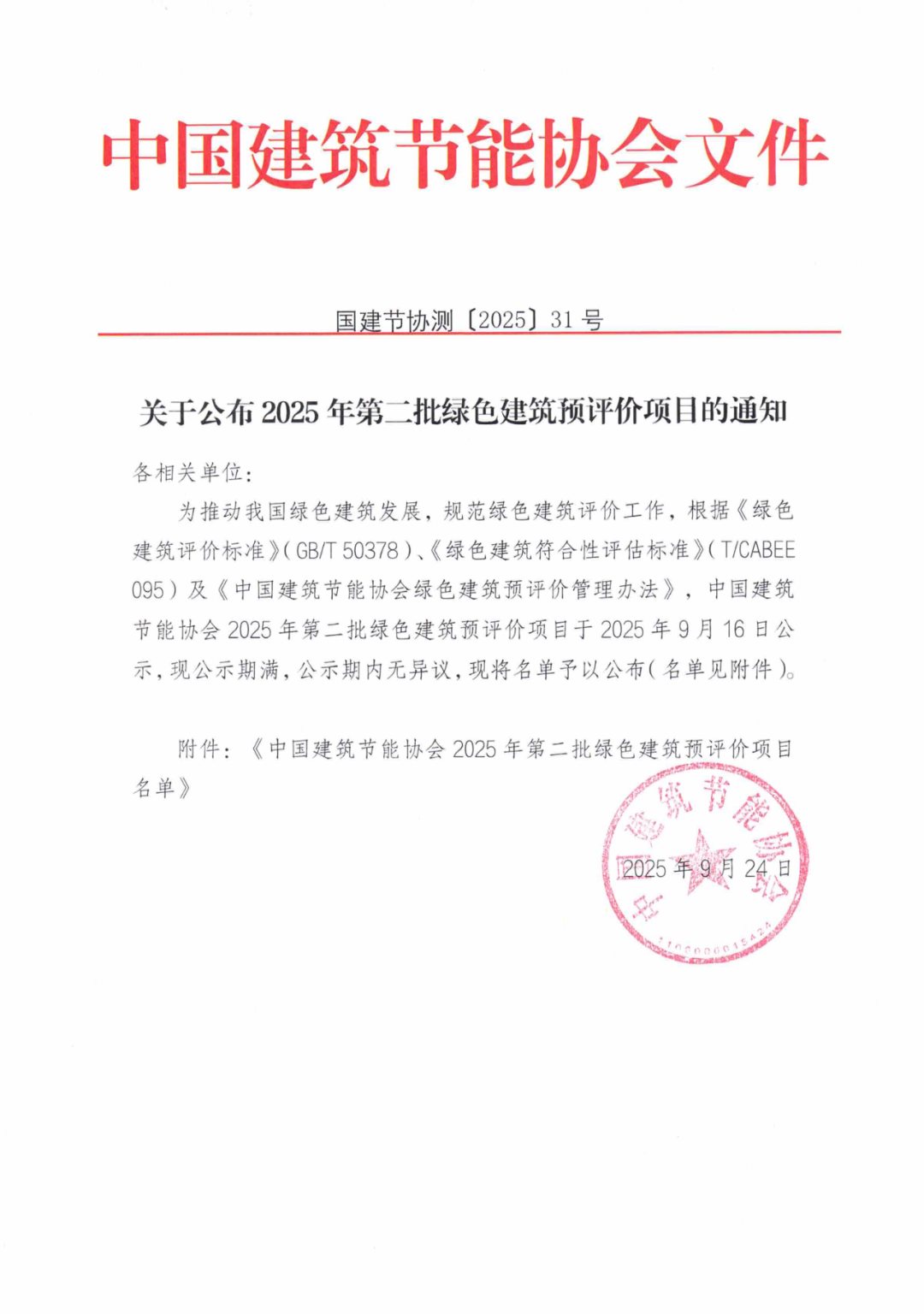为推动我国绿色建筑发展,规范绿色建筑评价工作,根据《绿色建筑评价标准》(GB/T 50378)、《绿色建筑符合性评估标准》(T/CABEE 095)及《中国建筑节能协会绿色建筑预评价管理办法》,中国建筑节能协会2025年第二批绿色建筑预评价项目于2025年9月16日公示,现公示期满,公示期内无异议,现将名单予以公布(名单见附件)。
