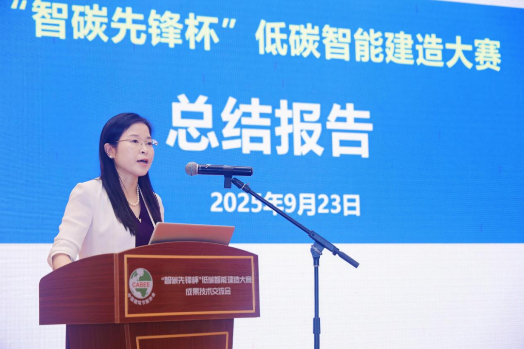 随后,中国建筑节能协会王海霞副秘书长对 “智碳先锋杯” 低碳智能建造大赛作总结报告。她全面回顾了大赛从前期筹备、实施到评选结果的全过程,不仅提炼了大赛在技术集成、全周期低碳实践等方面的突出亮点,更总结出赛事设计精准化、成果转化高效化、产业生态协同化等宝贵经验,让现场嘉宾对大赛推动建筑领域低碳转型的持续价值有了更深刻认知。