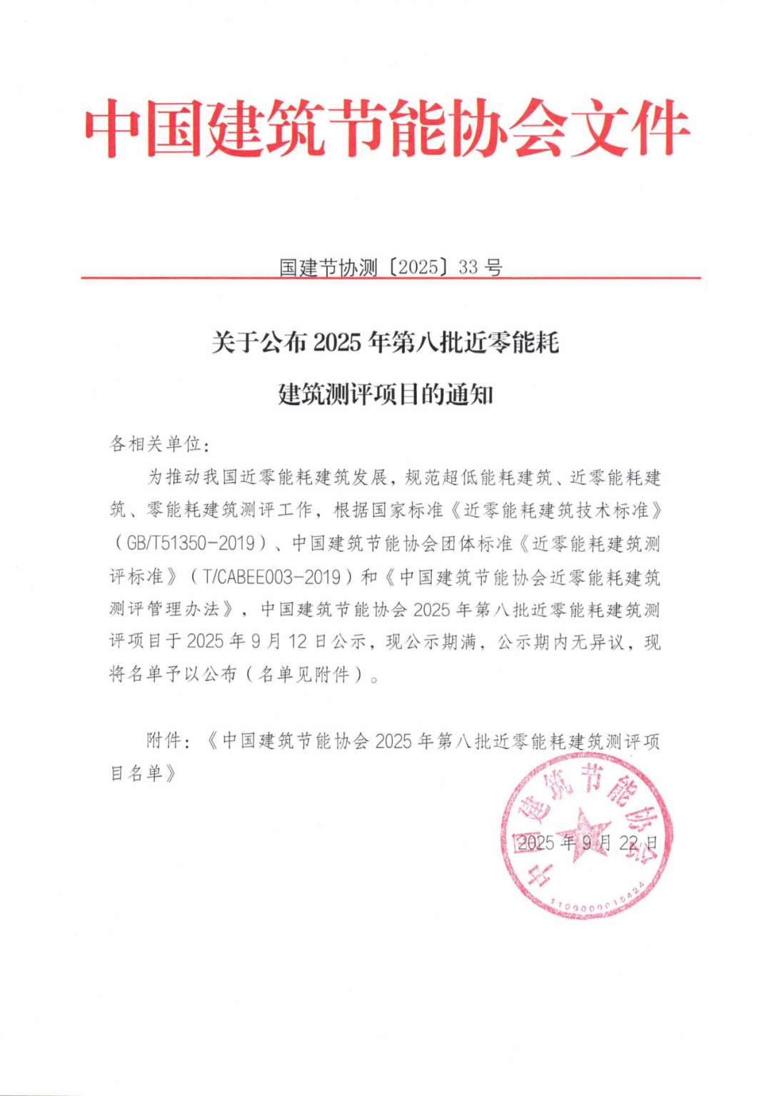 为推动我国近零能耗建筑发展,规范超低能耗建筑、近零能耗建筑、零能耗建筑测评工作,根据国家标准《近零能耗建筑技术标准》(GB/T51350-2019)、中国建筑节能协会团体标准《近零能耗建筑测评标准》(T/CABEE003-2019)和《中国建筑节能协会近零能耗建筑测评管理办法》,中国建筑节能协会2025年第八批近零能耗建筑测评项目于2025年9月12日公示,现公示期满,公示期内无异议,现将名单予以公布(名单见附件)。