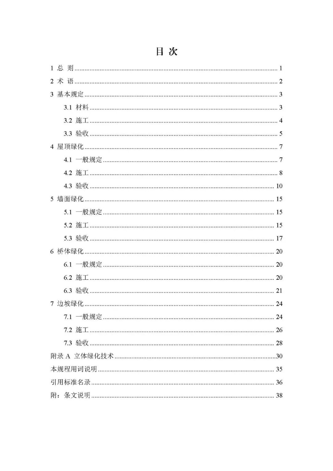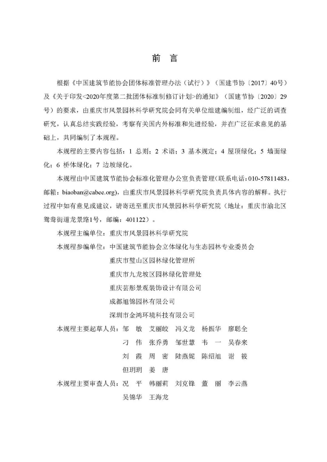 全球气候变化:近百年来,全球温度上升趋势明显!2011-2020年平均温升相比工业化前增高了1.09℃,1750年左右以来,温室气体浓度增加主要是由人类活动造成的。气候变化主要表现为极端高温事件、海洋热浪和强降水的频率和强度增加(IPCC第六次报告)。城市环境污染:近年来,全球环境污染严峻!据统计,因大气污染每年超额死亡人数高达178000人,水污染事故超过1600起/年,处于噪音污染的城市居民量达到40%。研究表明,立体绿化在降低城市温度,改善城市环境质量等方面效益显著。随着城市化建设的深入,城市土地资源日益紧张,传统的平面绿化方式已经难以满足城市绿化的需求,立体绿化作为一种新型的绿化方式,不仅能够在有限的空间内增加绿化面积,还能有效改善城市局部小气候、维持碳氧平衡、净化空气、涵养水分、丰富物种多样性。本规程的编制,可以规范立体绿化工程的施工和验收过程,确保工程质量,推动立体绿化技术的科学发展和应用;是响应生态文明建设需求、改善城市生态环境、提升城市形象和居民生活质量的重要举措,对于促进城市可持续发展具有重要的现实意义和深远的战略意义。本规程编制思路遵循科学性、系统性、实用性和前瞻性原则,确保本规程合理性和可操作性,为城市立体绿化工程的建设提供指导和规范。具体步骤和内容如下:1.需求分析:调研我国城市绿化现状和需求;分析立体绿化在城市发展中的作用和潜力。2.政策和法规依据:参照国家和地方关于城市绿化、生态环境保护的法律法规;结合现行的园林绿化、建筑规范等相关规定。3.目标和原则:明确立体绿化标准编制的目标;确定编制原则。4.技术调研:收集和分析国内外立体绿化的技术资料和案例;研究不同立体绿化技术的特点、适用性和限制。5.关键技术要素:确定立体绿化的关键技术要素,如植物选择、栽培基质、支撑结构及灌溉系统等。6.标准框架设计:设计规程编制的基本框架,包括总则、术语、基本规定、屋顶绿化、墙面绿化、桥体绿化及边坡绿化等。7.详细条款制定:对每一部分条款进行详细制定,包括具体的技术参数、操作步骤、质量标准等。8.风险评估与安全规范:评估立体绿化可能存在的风险,制定相应的安全规范和预防措施。9.公众参与和利益相关方协商:鼓励公众参与标准编制过程,征求利益相关方的意见和建议。10.专家评审和修订:组织专家对标准草案进行评审,根据反馈进行修订和完善。11.宣传和培训:制定本规程的宣传计划,对相关人员进行培训,提高标准的认知度和执行力。12.实施与监督:明确本规程的实施主体和监督机制,确保规程得到有效执行。13.持续更新:建立规程定期评估和更新机制,以适应技术发展和市场需求的变化。本规程适用于新建、改建、扩建的屋顶绿化、墙面绿化、桥体绿化、边坡绿化的工程施工与质量验收。本规程共7章,主要内容包括:1 总则;2 术语;3 基本规定;4 屋顶绿化;5 墙面绿化;6 桥体绿化;7 边坡绿化。对我国屋顶绿化、墙面绿化、桥体绿化、边坡绿化四种主要类型的立体绿化在材料、施工、验收三个方面的通用要求进行了规定。针对屋顶绿化的普通防水层、耐根穿刺防水层、防水保护层、排(蓄)水层、过滤层、种植土层、植被层、灌溉工程、照明工程及附属设施等方面的施工和验收进行了规定。针对墙面绿化的防水、钢龙骨结构、给排水工程、种植容器、种植土、植被层及照明工程等方面的施工和验收进行了规定。针对桥体绿化的钢龙骨结构、给排水工程、种植容器、种植土及植被层等方面的施工和验收进行了规定。针对边坡绿化的固定支撑结构、给排水工程、种植结构层、种植土及植被层等方面的施工和验收进行了规定。