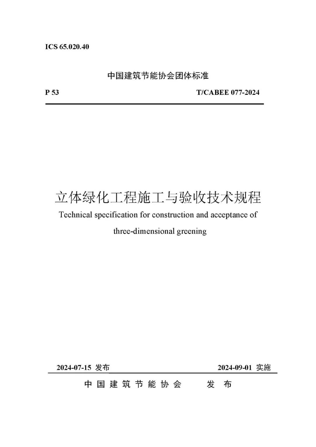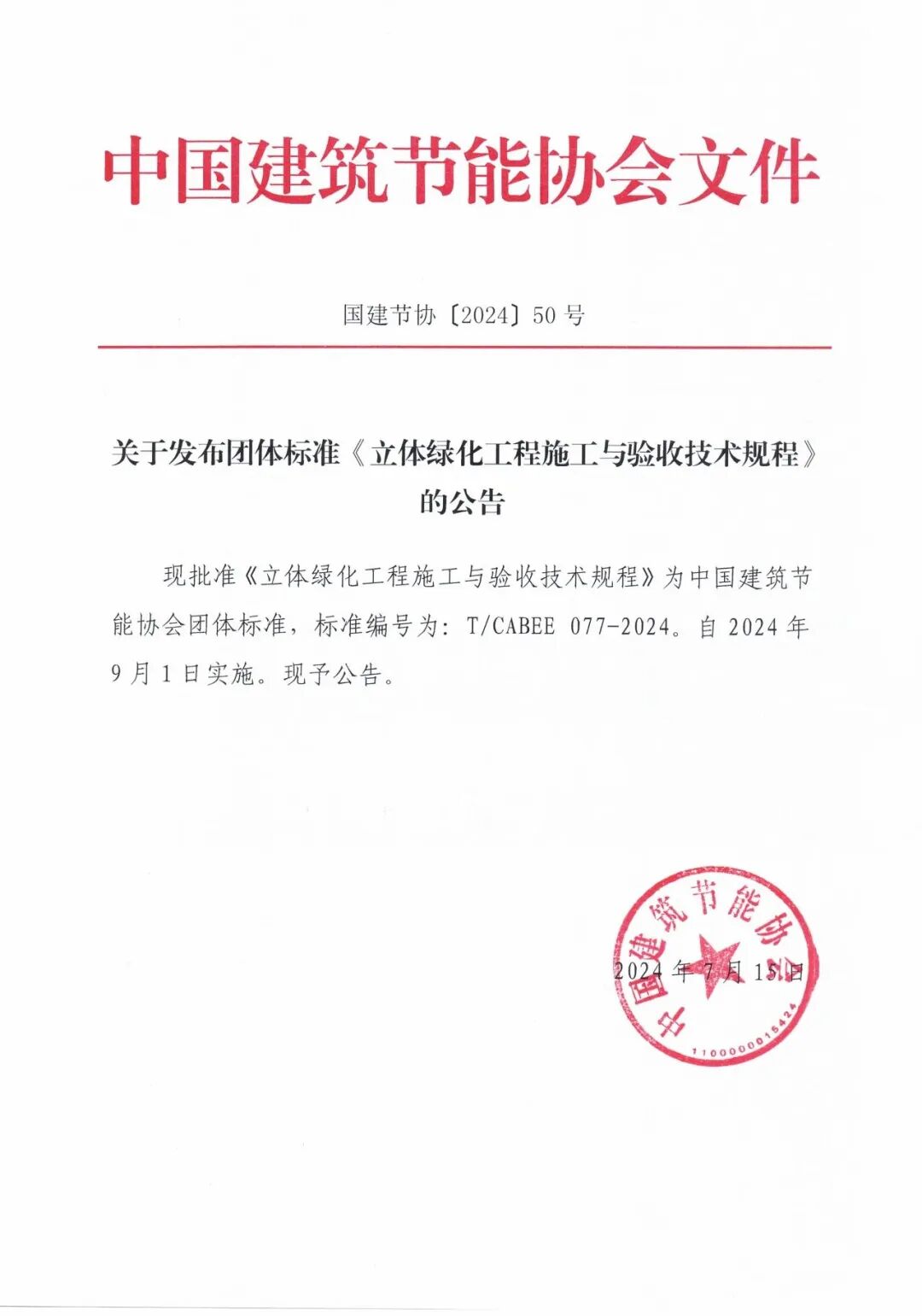 现批准《立体绿化工程施工与验收技术规程》为中国建筑节能协会团体标准,标准编号为:T/CABEE 077-2024。自2024年9月1日实施。现予公告。