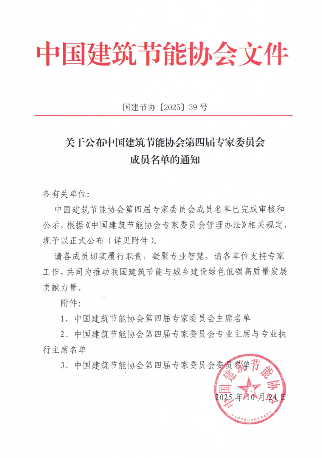 中国建筑节能协会第四届专家委员会成员名单已完成审核和公示,根据《中国建筑节能协会专家委员会管理办法》相关规定,现予以正式公布(详见附件)。