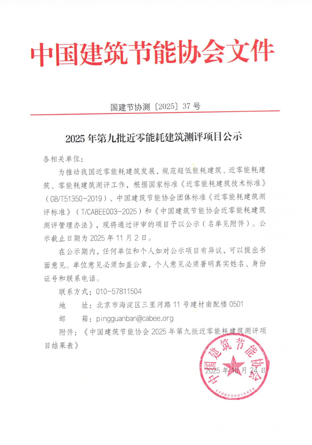 为推动我国近零能耗建筑发展,规范超低能耗建筑、近零能耗建筑、零能耗建筑测评工作,根据国家标准《近零能耗建筑技术标准》(GB/T51350-2019)、中国建筑节能协会团体标准《近零能耗建筑测评标准》(T/CABEE003-2025)和《中国建筑节能协会近零能耗建筑测评管理办法》,现将通过评审的项目予以公示(名单见附件)。公示截止日期为2025年11月2日。