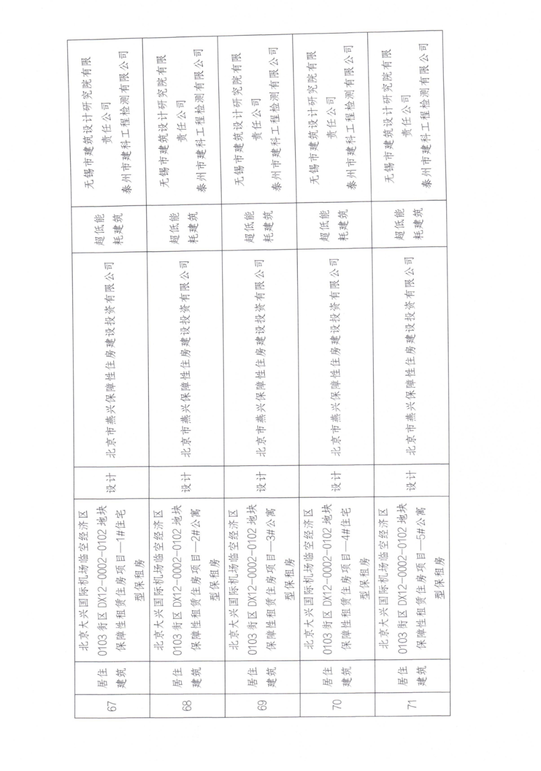 71 | 居住建筑 | 北京大兴国际机场临空经济区0103街区DX12-0002-0102地块保障性租赁住房项目—5#公寓型保租房 | 设计 | 北京市燕兴保障性住房建设投资有限公司 | 超低能耗建筑 | 无锡市建筑设计研究院有限 责任公司 |