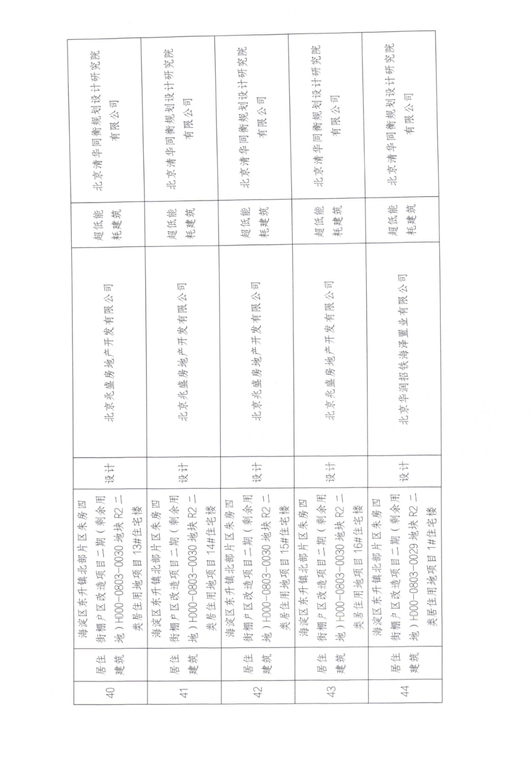 44 | 居住建筑 | 海淀区东升镇北部片区朱房四街棚户区改造项目二期(剩余用地)HD00-0803-0029地块R2二类居住用地项目1#住宅楼 | 设计 | 北京华润招铁海泽置业有限公司 | 超低能耗建筑 | 北京清华同衡规划设计研究院 有限公司 |