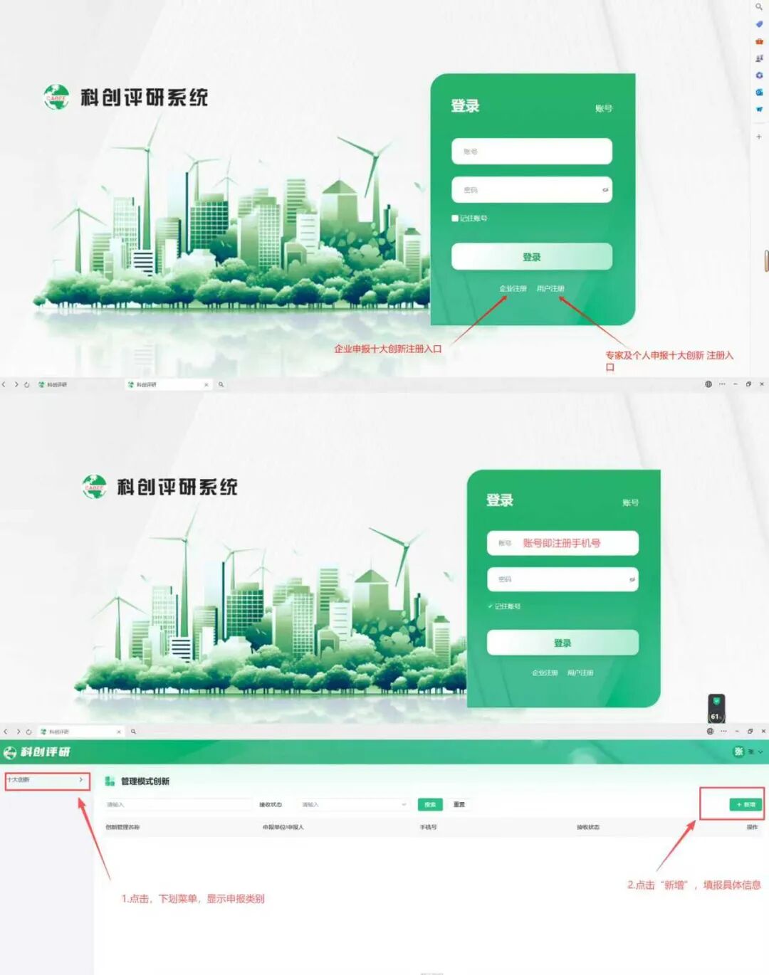 请各申报单位登录中国建筑节能协会统一网上申报系统(网址链接为kcpy.0cb.org.cn,平台开放时间为10月24日上午10:00),在线填报《城乡建设行业绿色发展十大创新推荐表》(详见附件1、2),并上传加盖公章的证明材料电子版。申报材料经协会技术部统一受理后,将进行分类并组织专家委员会进行评审。