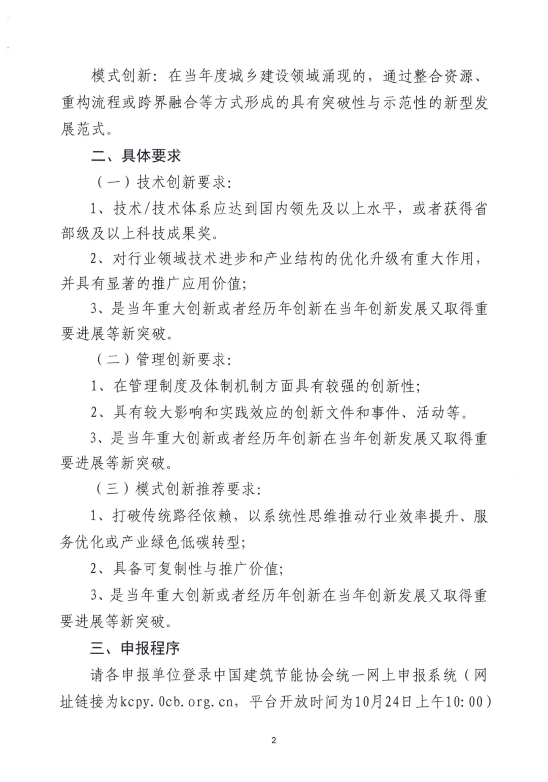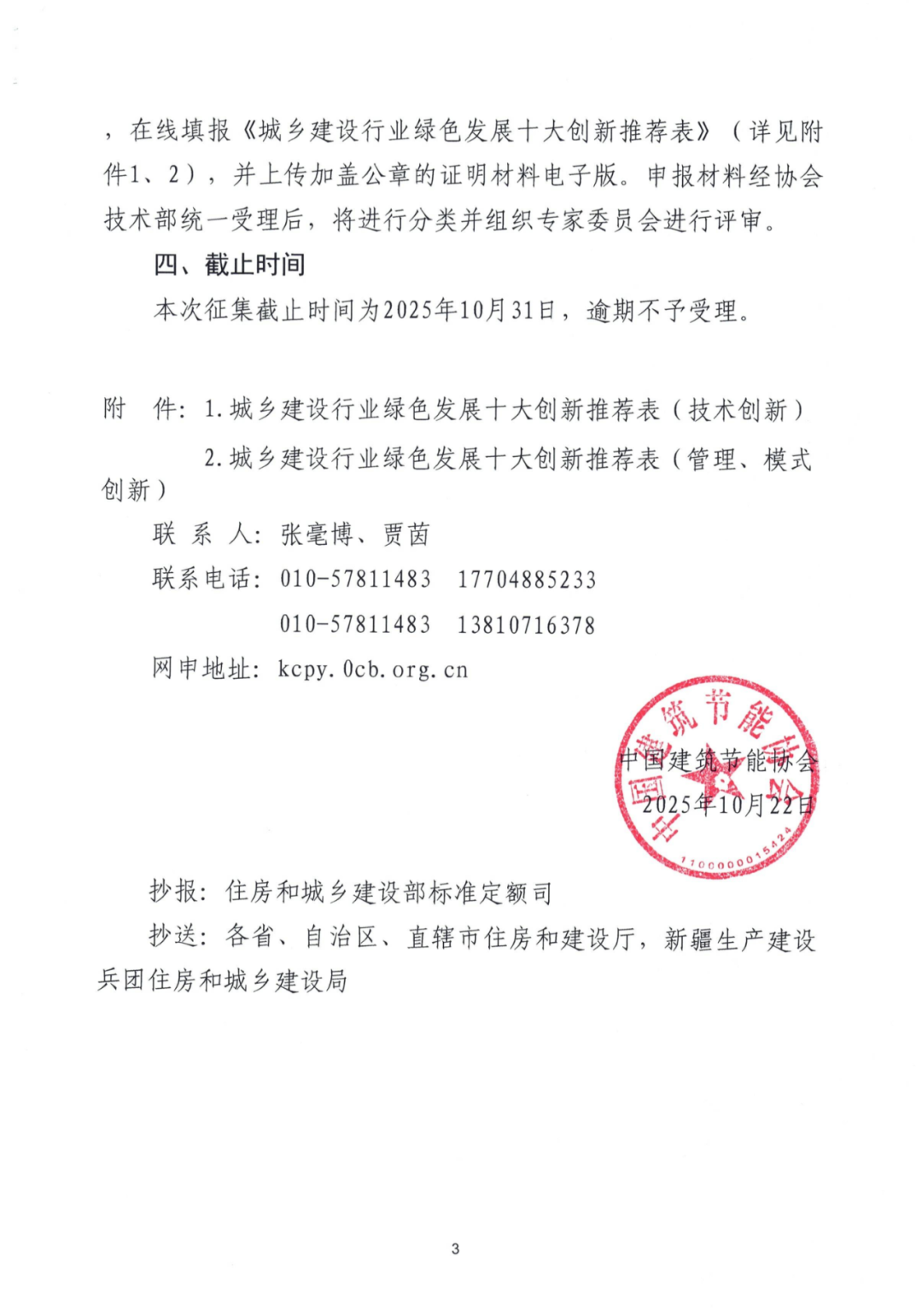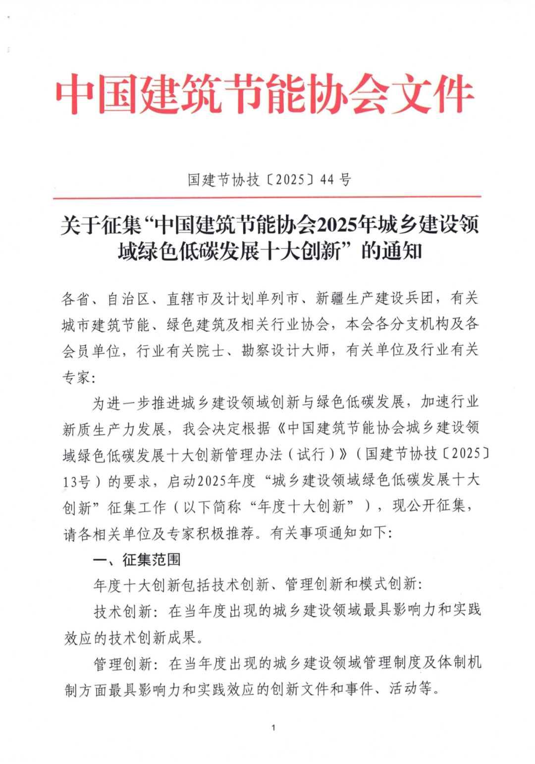 为进一步推进城乡建设领域创新与绿色低碳发展,加速行业新质生产力发展,我会决定根据《中国建筑节能协会城乡建设领域绿色低碳发展十大创新管理办法(试行)》(国建节协技〔2025〕13号)的要求,启动2025年度“城乡建设领域绿色低碳发展十大创新”征集工作(以下简称“年度十大创新”),现公开征集,请各相关单位及专家积极推荐。有关事项通知如下: