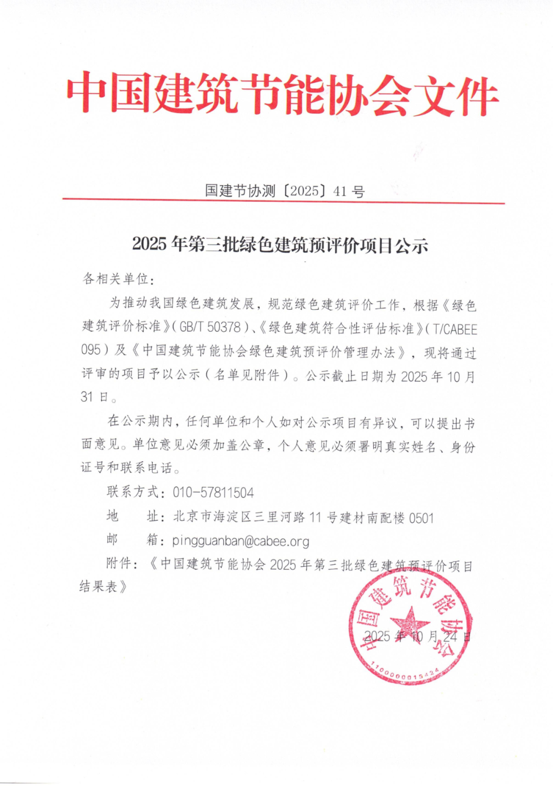 为推动我国绿色建筑发展,规范绿色建筑评价工作,根据《绿色建筑评价标准》(GB/T 50378)、《绿色建筑符合性评估标准》(T/CABEE 095)及《中国建筑节能协会绿色建筑预评价管理办法》,现将通过评审的项目予以公示(名单见附件)。公示截止日期为2025年10月31日。