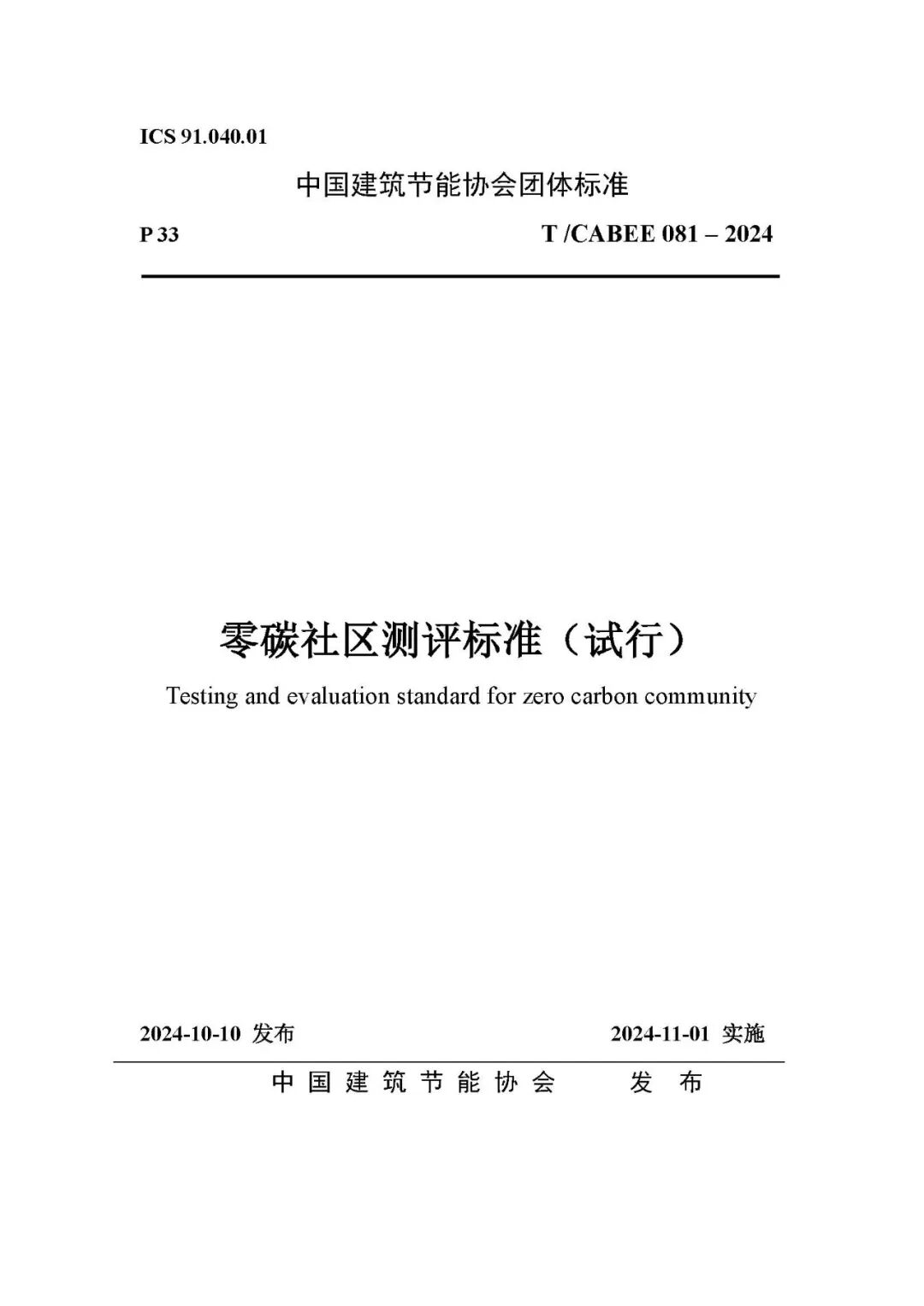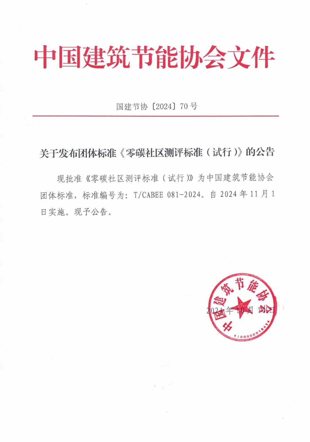 现批准《零碳社区测评标准(试行)》为中国建筑节能协会团体标准,标准编号为:T/CABEE 081-2024。自2024年11月1日实施。现予公告。
