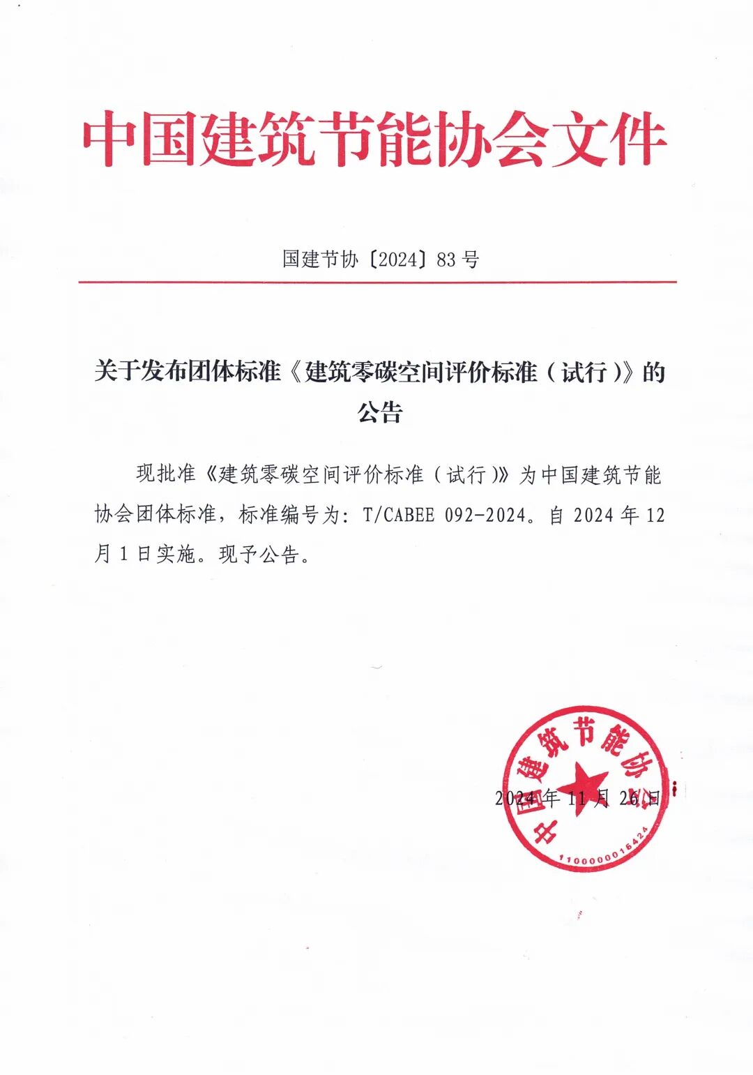 现批准《建筑零碳空间评价标准(试行)》为中国建筑节能协会团体标准,标准编号为:T/CABEE 092-2024,自2024年12月1日起实施。现予公告。团标起草单位: