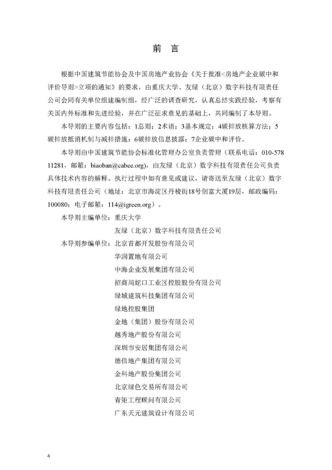 自2020年我国提出“二氧化碳排放力争于2030年前达到峰值,努力争取2060年前实现碳中和”的“双碳目标”以来,我国“1+N”政策体系已经建立完成。碳达峰、碳中和是经济社会一场广泛而深刻的系统性变革,同时也开启了我国低碳发展的新时代。2024年3月15日,国家发展改革委、住房城乡建设部印发《加快推动建筑领域节能降碳工作方案》;2024年5月23日,国务院印发《2024-2025年节能降碳行动方案》;上述文件表明我国建筑领域节能降碳工作进入了夯实基础、加大攻坚力度的新阶段。房地产业发展关系人民群众切身利益,不仅显著改善居民居住条件,还在拉动经济增长、促进就业等方面发挥重要作用。房地产企业碳排放总量大、强度大,在国民经济运行中具有产业链链长的作用,在碳减排问题上应当承担更大责任。然而目前关于房地产企业层面的碳排放相关标准较为缺乏,房地产上市企业披露的碳排放信息相关碳排放数据存在于口径不一致、数据质量差、缺乏可比性等众多问题,急需建立一套统一规范的方法。《房地产企业碳中和评价导则》对房地产企业的碳排放核算、碳减排计算、碳信息披露、碳中和评价等方面进行统一规范,将对房地产行业的低碳发展发挥重要的推动作用。本导则在《建筑碳排放计算标准》GB51366-2019的建筑碳排放计算基础上,研究针对房地产企业层级的碳排放计算规则,并对房地产企业碳排放抵消、减排、披露、评价与认证方法进行了规定。导则编制为房地产企业碳排放核算及评价工作提供了技术支撑,对推动房地产企业、行业低碳发展具有促进作用。三、内容简介