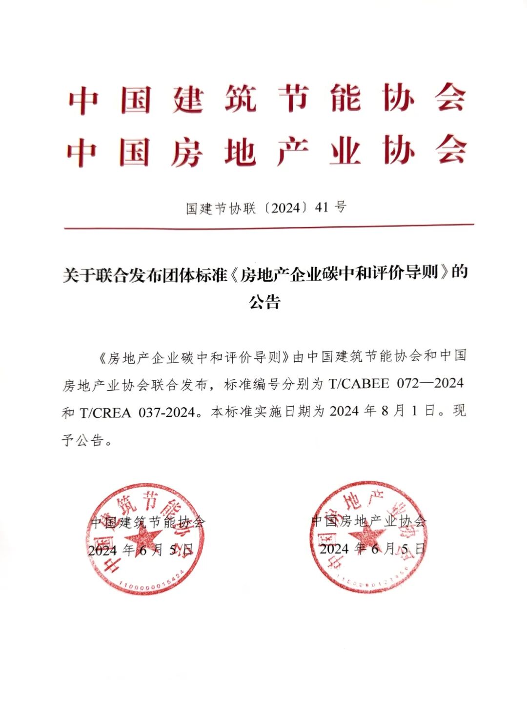 《房地产企业碳中和评价导则》由中国建筑节能协会和中国房地产业协会联合发布,标准编号分别为T/CABEE 072-2024和T/CREA 037-2024。本标准实施日期为2024年8月1日。现予公告。